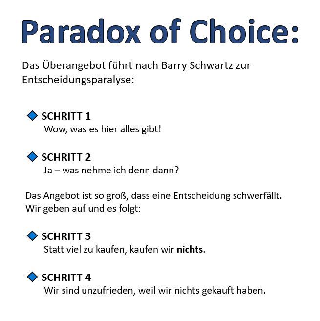 Das ist das Paradoxon. Selbst wenn eine Entscheidung getroffen wurde, kann die Vielzahl der Alternativen dazu führen, dass wir uns fragen, ob eine andere Wahl besser gewesen wäre.