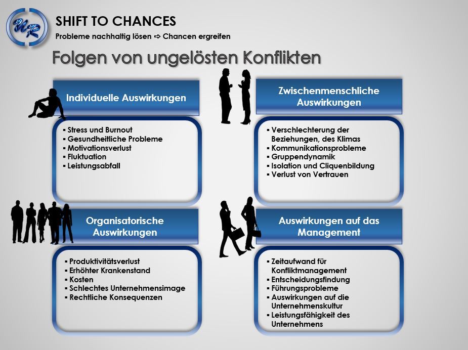 Ungelöste Konflikte haben eine Reihe unangenehmer Folgen. Sowohl für den Betroffenen selbst als auch für das Umfeld wie zum Beispiel ein Unternehmen.
